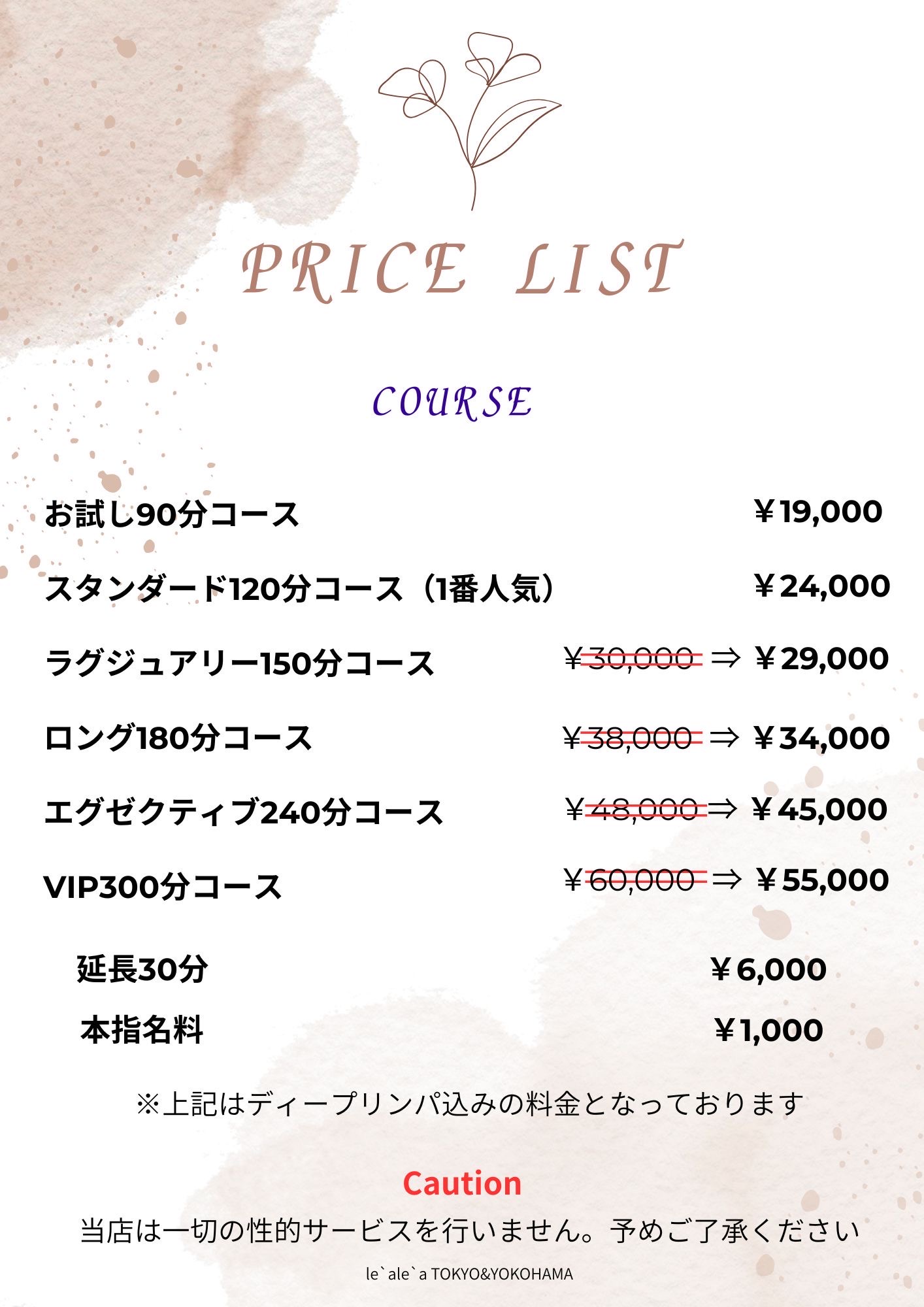 ※当店はコースの長さに関係なくディープリンパ込の明朗会計(総額表示)となっております